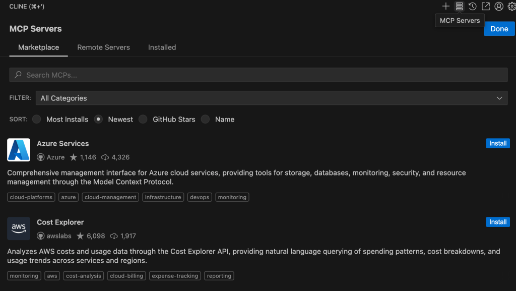- Open Cline → MCP Servers → Installed → Configure MCP Servers.