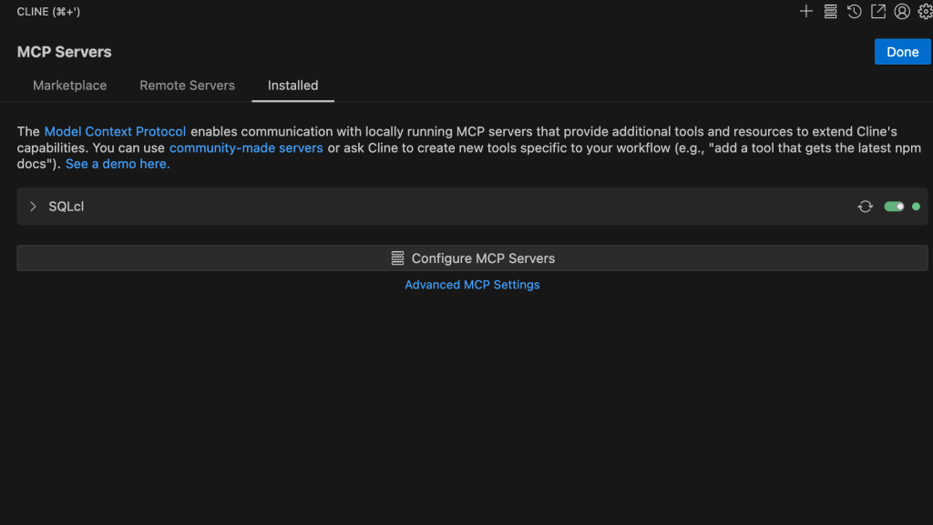 Save the file. SQLcl will now appear in the Installed MCP Servers list.