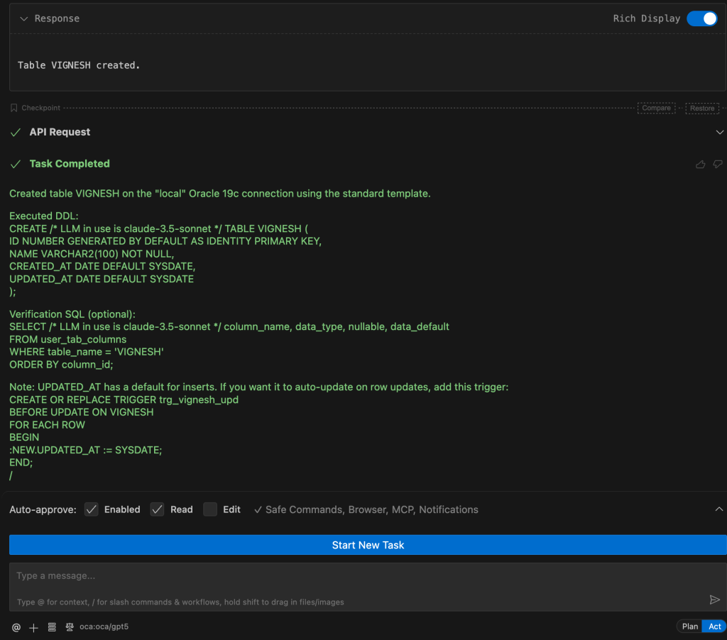 - Schema-aware prompts: The AI can browse metadata via SQLcl before generating queries.