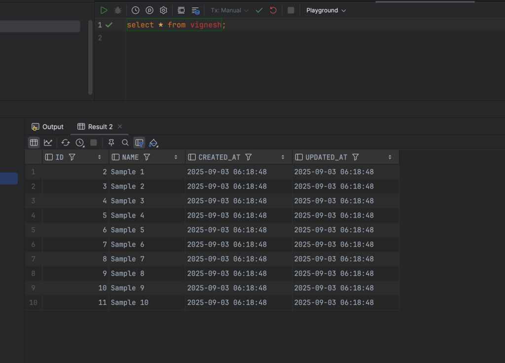 Record with NAME = 'Sample 9' exists in table VIGNESH.